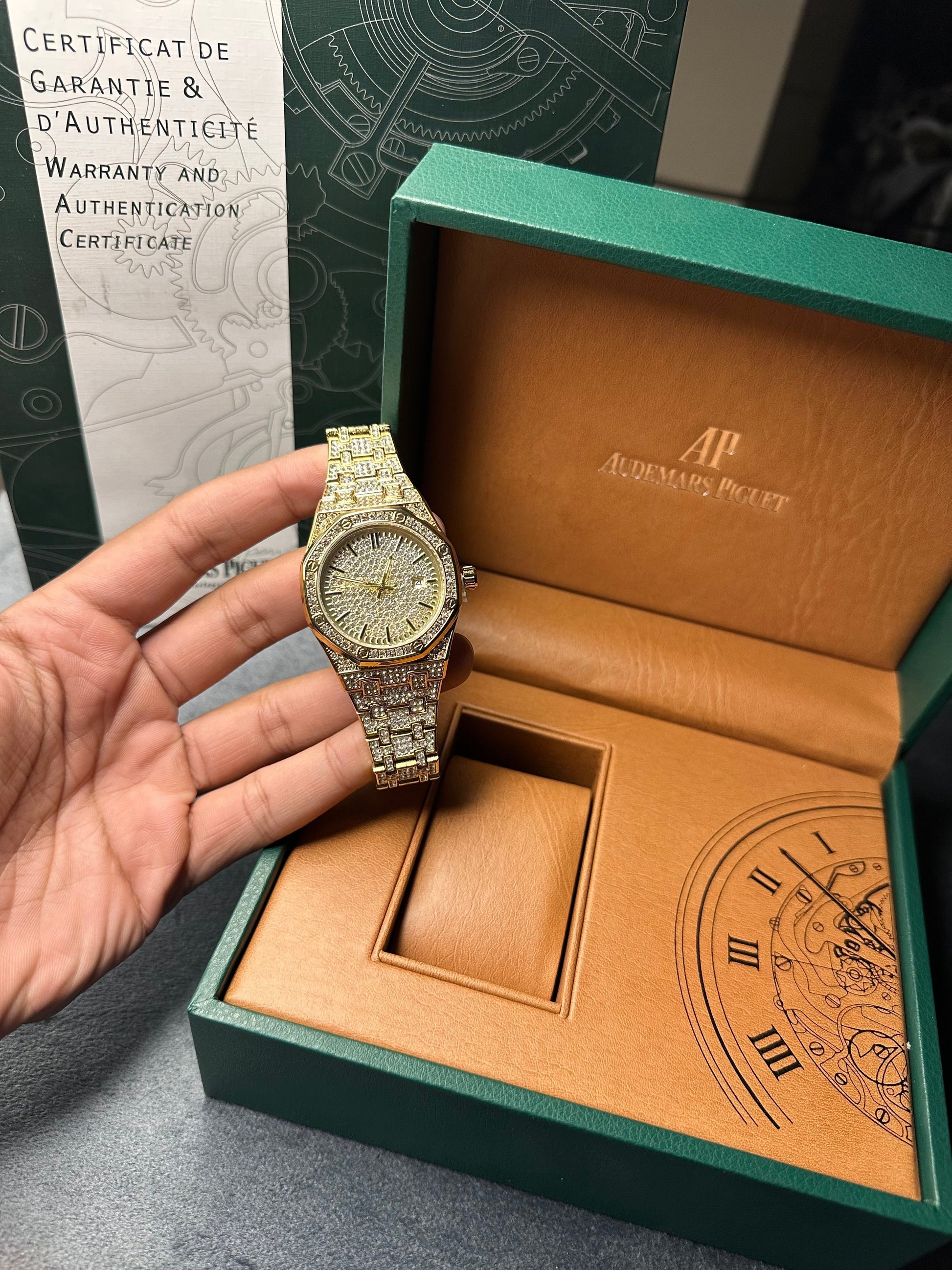 Elevate your style with our Audemars Piguet Style Iced Tone Watch, available in two stunning colors: Gold and Silver. This heavyweight beauty features high-quality stones that shimmer with elegance, making it perfect for both casual and formal occasions.
